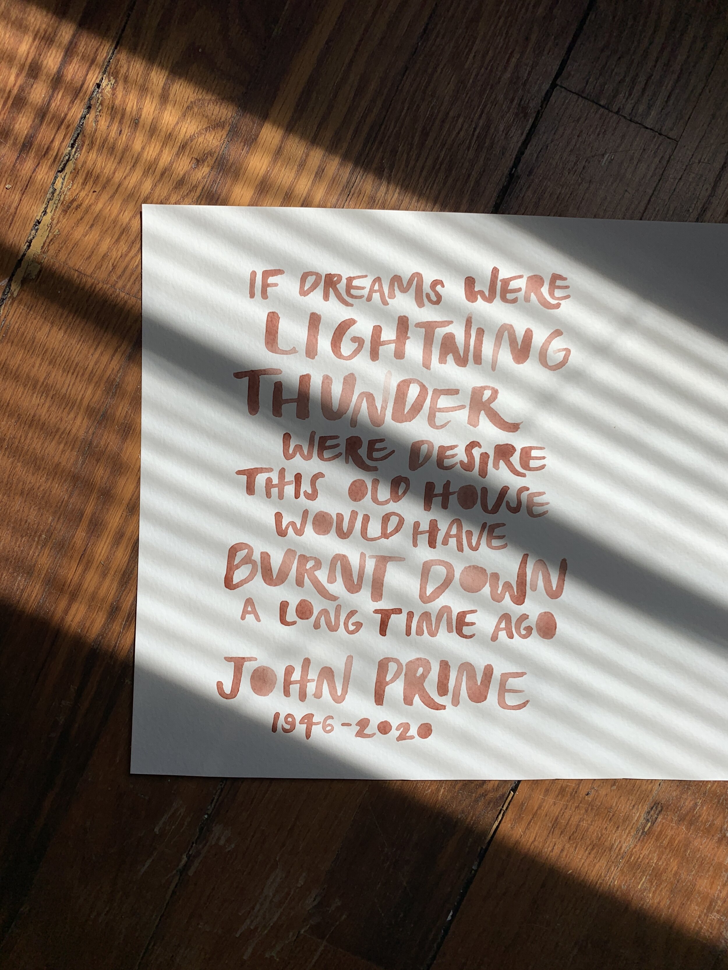 John Prine lyric from, “Angels from Montgomery” brush lettered with avocado pit watercolor pigment.